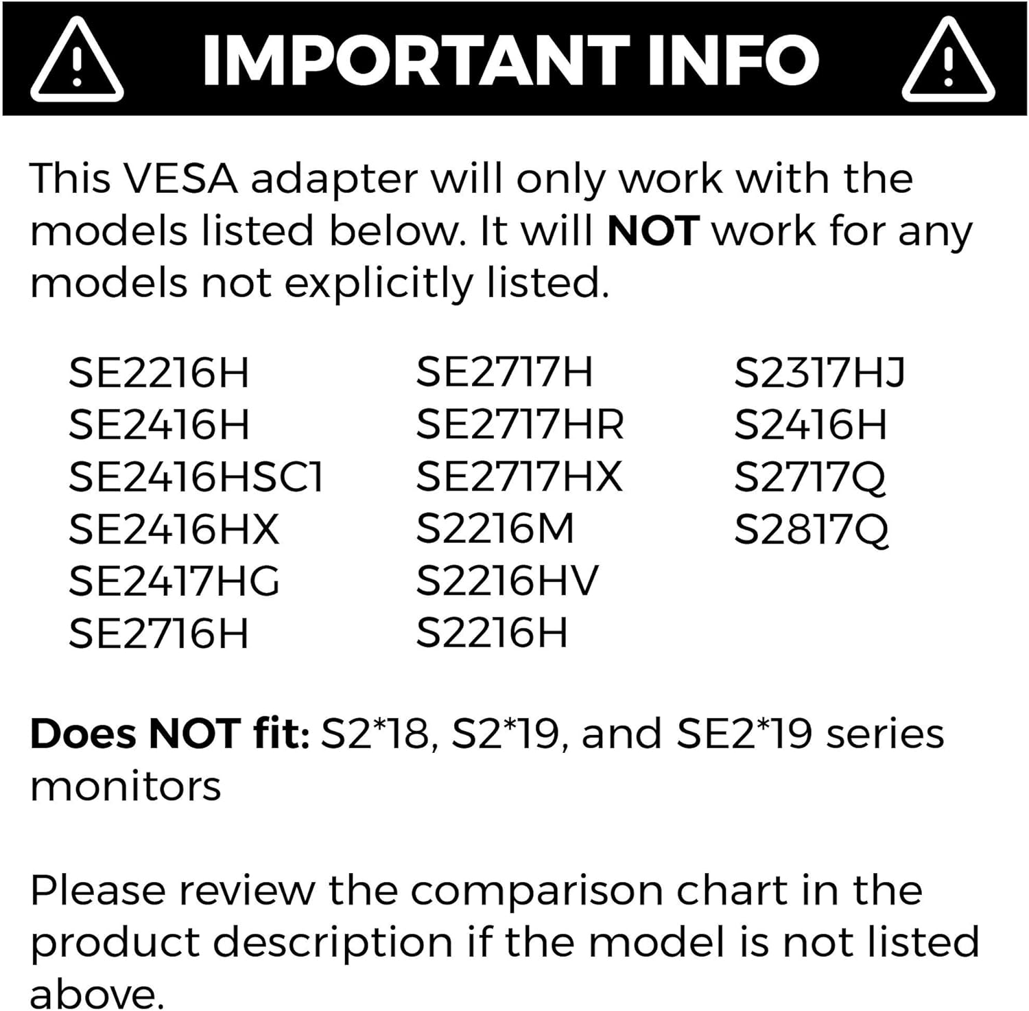 Fits dell se2416hx se2717h hx s2216m hv se2716h se2216h s2817q se2417hg s2316m s2316h se2416h and more product description bought a dell s or se series monitor and disappointed that you can t vesa mount it.